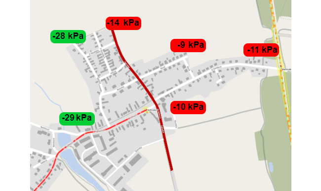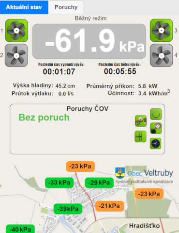 Informativní mapa jednotlivých tlaků v systému podtlakové kanalizace umožňuje obsluze snadněji odhalovat zavodněné (nefunkční) části sběrného potrubí a předcházet tak pomocí přivzdušnění dlouhým výpadkům funkce jednotlivých větví a zaplavování kanalizačních šachet. Monitoring tlaků koncových větví spolu s možností spustit dočasně vývěvy v tzv. vyhledávacím režimu dává rychlý přehled o stavu podtlakové kanalizace a usnadňuje lokalizaci případného problému. Ovládání a sledování je možné i v terénu prostřednictvím mobilním telefonu.